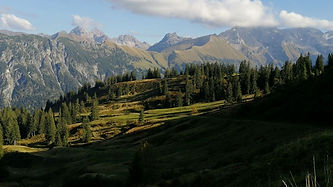 Von Langenwang (770 m) gehts erst mal über Tiefenbach zum Rohrmoossattel. Dort zweigt ein Asphaltsträßchen rechts ab (Höhe 1080 m), das mal mehr mal weniger steil hinaufführt. Ein heißer Tag, wenig Leute, schöne Landschaft. Oben freies Almgelände, Blick zu den Gottesackerwänden des Ifen. Schließlich die Alpe auf 1460 m, wo es Weißbier gibt.